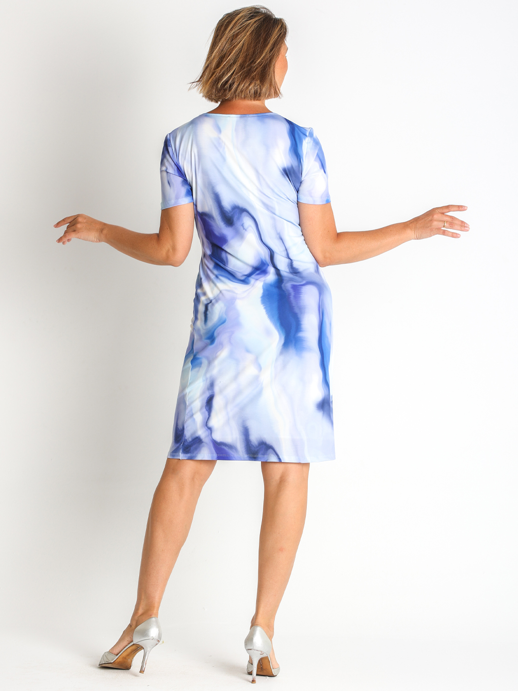 Vestido envolvente y manga corta fabricado en tejido de punto estampado, suave y elástico para mayor comodidad.